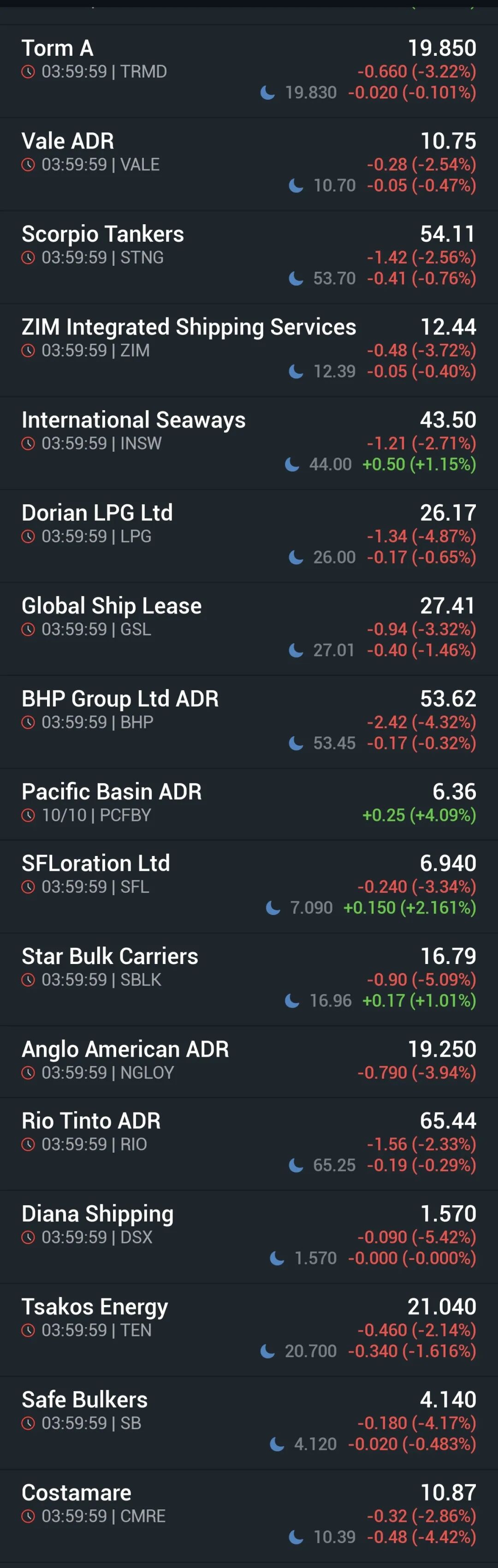 美国时间10月10日下午16:00美国航运股较前一日的收盘价