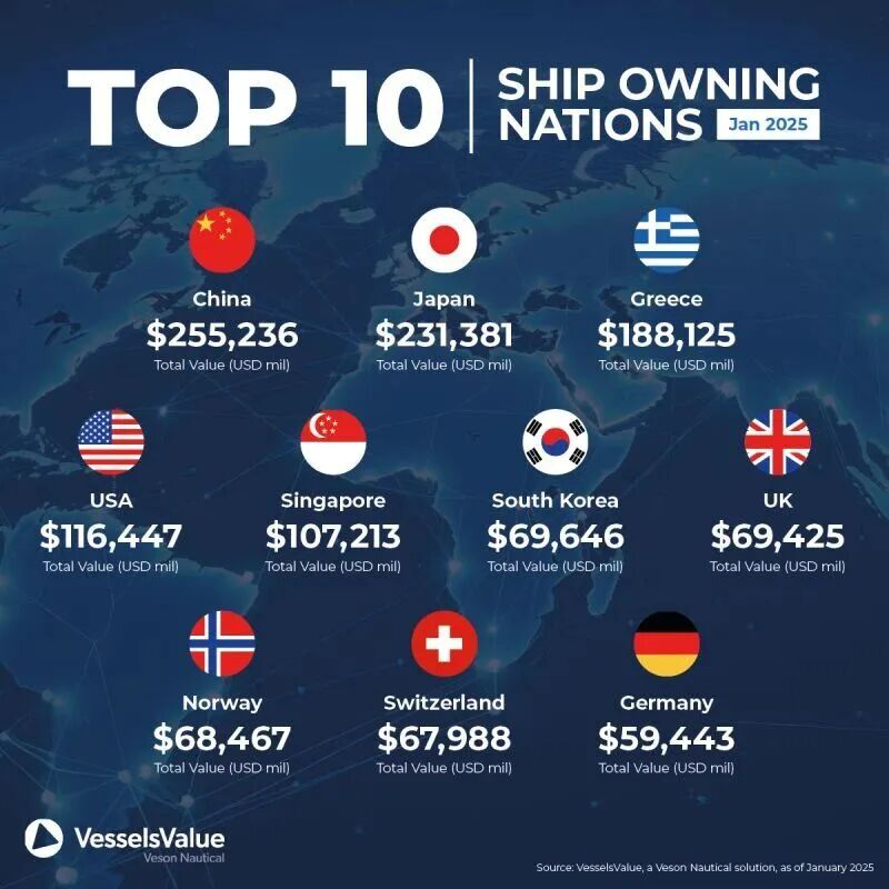 这意味着虽然美国建造以及悬挂美国船旗的船舶数量并不多,但是由美国公司运营,或由美国资本控制的船队规模或许并不像想象中那么小。比如根据VesselsValue统计的数据显示,截至2025年1月,按照旗下船队价值计算,美国实际上是世界第四大船东国。
