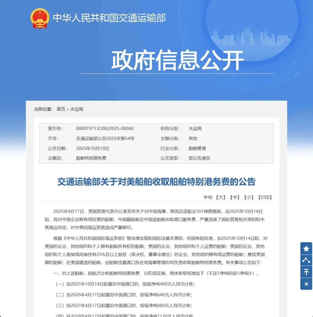 在我国修订《国际海运条例》、为反制美国“301调查”提供法律依据之后,中国政府正式公布了实质性反制措施。就在昨天(10月10日),我国交通运输部发布公告,决定自2025年10月14日起,对美国相关船舶征收“特别港务费”,以对等回应美方针对中国海运、物流及造船业的歧视性做法。