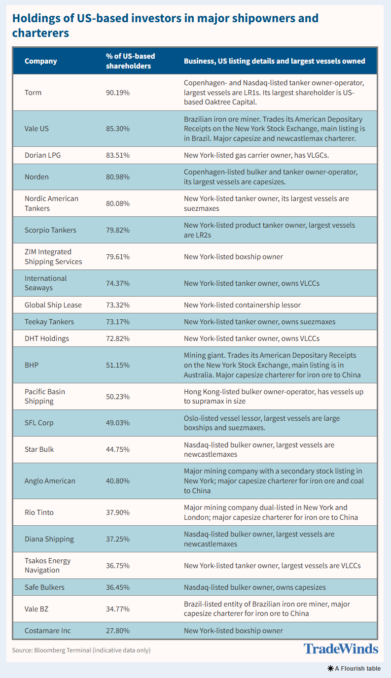根据航运媒体据《贸易风》调查显示,大多数上市船东的投资者结构中,美国股东所占比例超过25%,超过了中国即将实施的新规所设定的门槛。